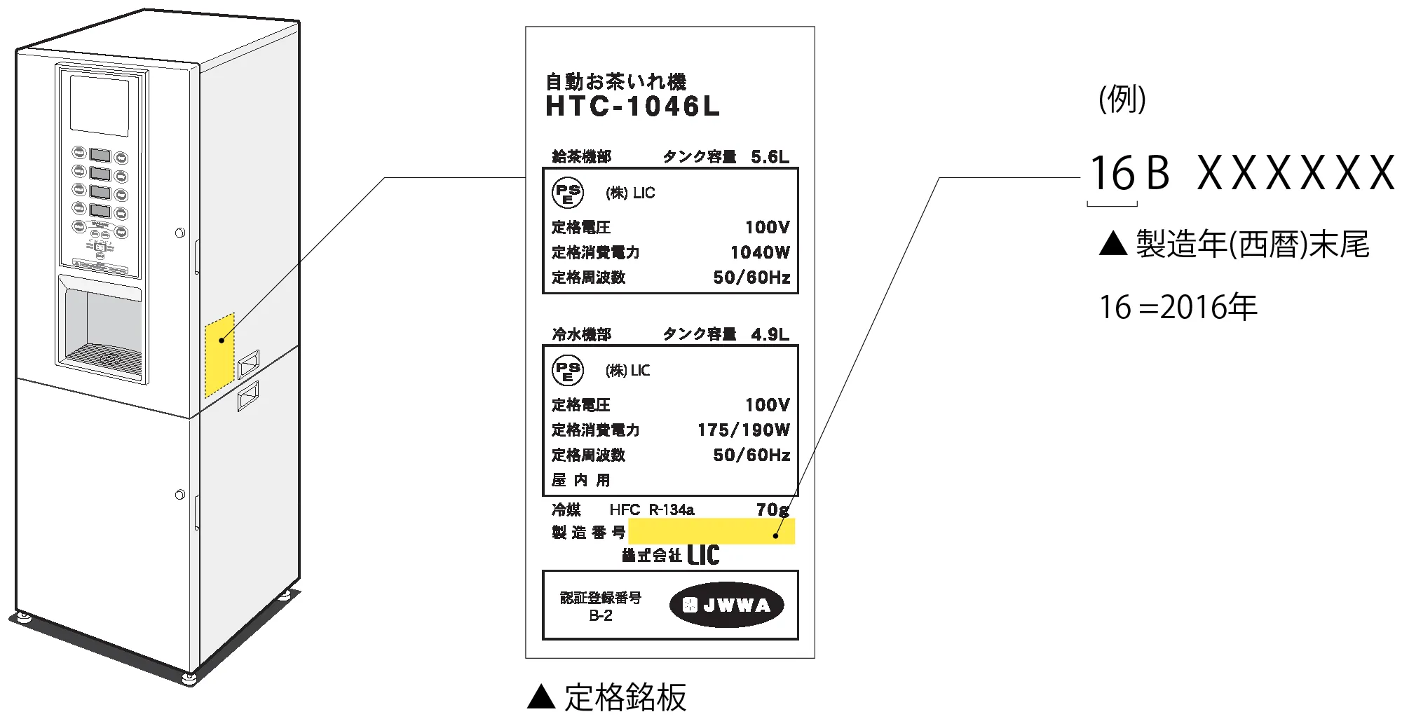 製品側面に貼付されている定格銘板から、製造番号をご覧ください。