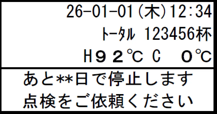 | 表示内容 | あと**日で停止します 点検をご依頼ください |